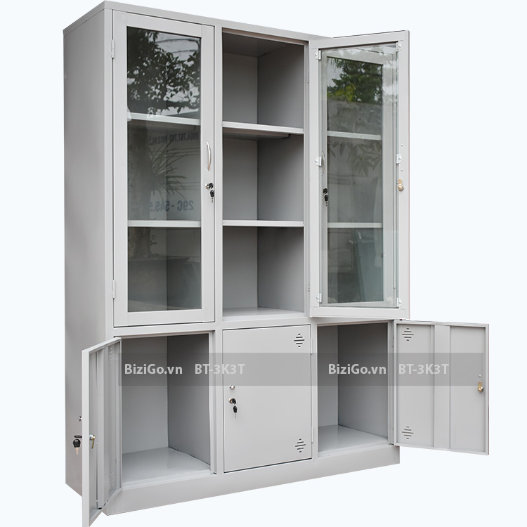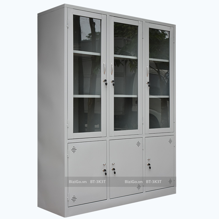 Tủ sắt hồ sơ văn phòng 3 cánh kính BT-3K3T được làm từ thép phủ sơn tĩnh điện màu ghi sáng, bền đẹp và an toàn khi sử dụng. Tủ được chia làm 3 khoang cánh kính bên trên và 3 khoang cánh sắt bên dưới. Mỗi khoang cánh có 2 đợt cố định chia khoang làm 3 ngăn để đồ, tài liệu, hồ sơ. Sử dụng 3 cánh kính suốt. Tay nắm mạ và 01 khóa Locker.