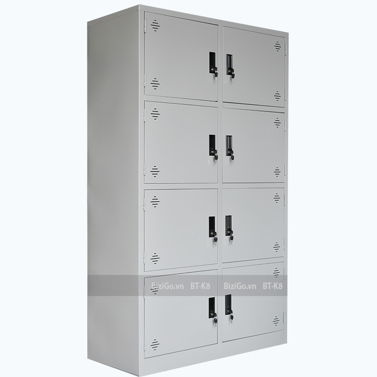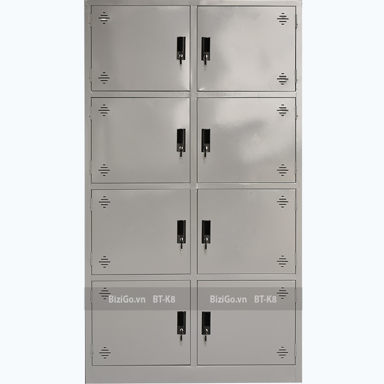 Tủ sắt hàn liền khối sơn tĩnh điện, gồm 8 khoang riêng biệt: Có 8 cánh, mỗi cánh có 1 khóa liền tay nắm nhựa.