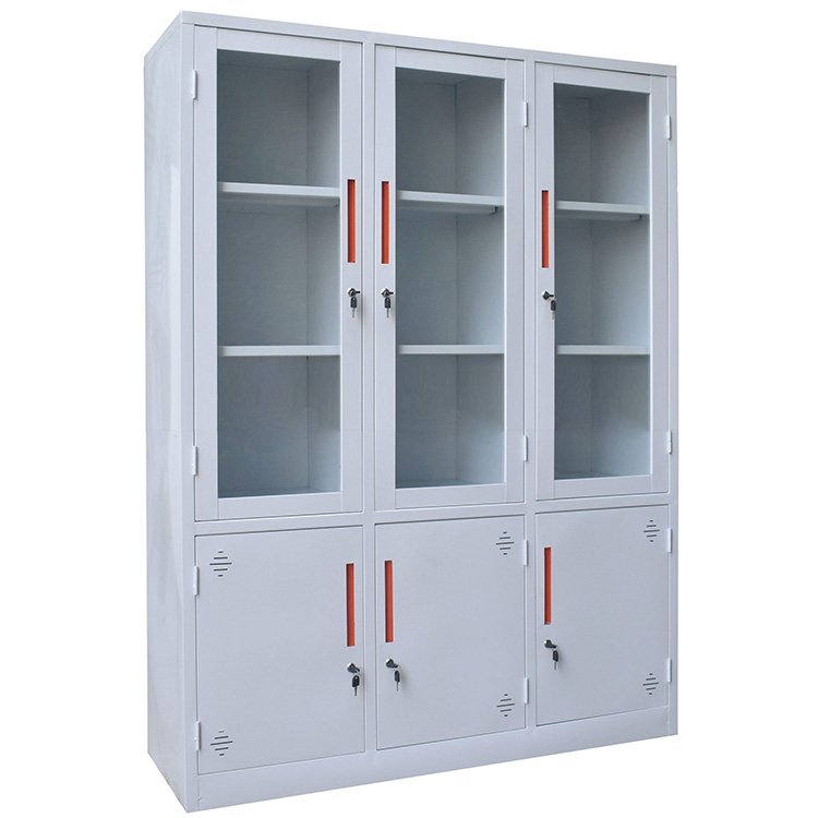 Tủ sắt văn phòng BT-3K3T-HD được làm từ thép phủ sơn tĩnh điện màu ghi sáng, bền đẹp và an toàn khi sử dụng. Tủ được chia làm 3 khoang cánh kính bên trên và 3 khoang cánh sắt bên dưới. Mỗi khoang cánh có 2 đợt cố định chia khoang làm 3 ngăn để đồ, tài liệu, hồ sơ. Sử dụng 3 cánh kính suốt. Tay nắm âm trong cánh và 01 khóa Locker.